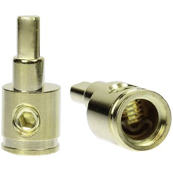 Overgangspinner for til bruk på forsterkerens terminaler når de ikke er kraftige nok for kabelen. Passer for 1,5-4mm2 ledning og loddes til kabelenden. Leveres i 2 par med 2 røde og 2 sorte. Med isolasjon.