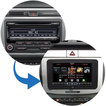 Car Audio Systems ryggekamera-interface med elektronikk som bevarer originalmontert ryggekamera ved bytte til en ettermarkedsradio på utvalgte VW og Skoda-modeller og bevarer de bevegelige hjelpelinjene som originalt når man svinger på rattet for modeller med HIGHLINE utstyrspakke. Dette er det samme produktet som Speedsignal B-3674755-H - men denne inneholder også innstikk for alle kablene og bevarer også AUX/org. forsterker etc uten ekstra deler nødvendig. Overgangen plugges bare i mellom kablene i bilen bak radioen og den nye radioen. Et rimeligere alternativ er A95105000+010.007-0 som du finner listet under tilbehør. Hvis man benytter A95105000+010.007-0 vil man bevare ryggekamera-bildet, men man mister parkeringsveilederen/aktive hjelpelinjer. Man må også finne parkeringsmodulen i de forskjellige bilmodellene som ikke er plassert bak bilens originale radio.